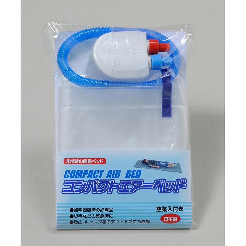 非常時の簡易ベッド。硬い床・冷たい床での体への負担を軽減します。空気入れ付きで簡単にふくらませます。耐荷重180kg