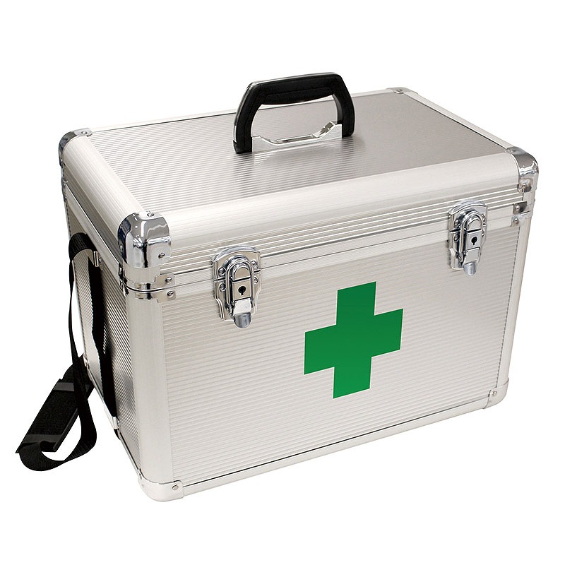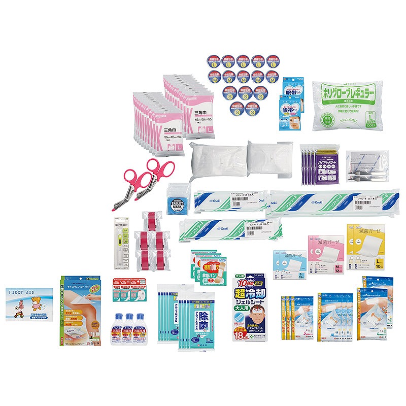 セット内容:三角巾×20、伸縮包帯(S×5M×5L×5)、滅菌ガゼ(S:15枚M:12枚L:10枚)×2、モイスキンパッド(4枚)、サジカルテプ×3、消毒液×3、消毒ウェットティシュ(10枚)×10、救急絆創膏(M:100枚)×3、防水パッド(S:6枚)×3(M:5枚)×3(L:4枚)×2、眼帯セット×2、ポリグロブ(L:100枚)、3Dマスク(ふつう:30枚こども用:20枚)、防寒用アルミシト×5、冷却シト(16枚)×2、万能ばさみ×2、刺抜きピンセット×2、電子体温計、ワンタッチ式駆血帯×5、ソフトシネ(5S×24S×23S×2)、一方弁マスク×2、救急ハンドブック、アルミケース