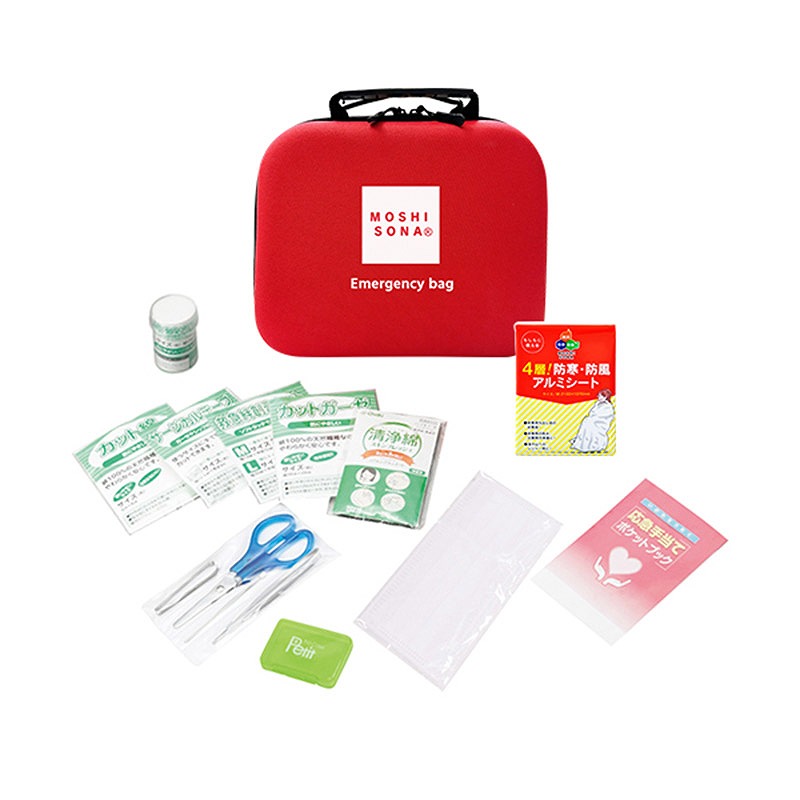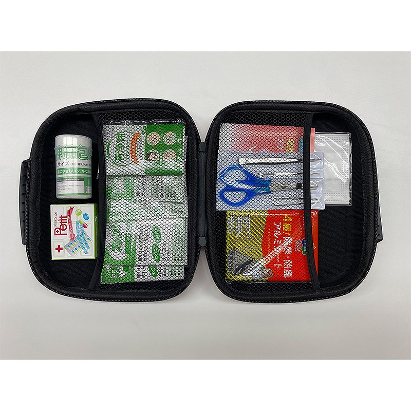 セット内容:(1)EVAバッグ、(2)アルミシト、(3)カット綿×3枚、(4)カットガゼ×3枚、(5)包帯、(6)救急絆創膏2サイズ×各3枚(医療機器届出番号:27B2×00110000008)、(7)サジカルテプ、(8)清浄綿 2枚入×3包、(9)ハサミ、(10)ピンセット、(11)毛抜き、(12)耳かき、(13)マスク、(14)応急手当てポケット ブック、(15)ピルケース