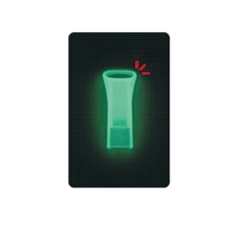 暗がりでも光る錆びないオール樹脂製のホイッスル。薄くても小型ながらも、人間の一番聞こえやすい約3000Hz付近の音を出せ音量も約95dBでます。肌触りの良いエステル製紐には約2.5kgの力が加わると外れる安全パーツが付いております。