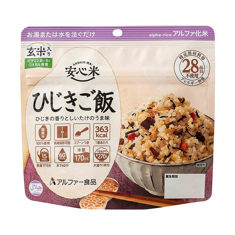 うるち米(国産)、味付乾燥具材(食塩、加工米(玄米(国産))、乾しいたけ、ひじき、デキストリン、酵母エキス、乾燥にんじん、砂糖、麦芽糖、大麦乳酸発酵液ギャバ)/カラメル色素、ビタミンB1、ビタミンB2
