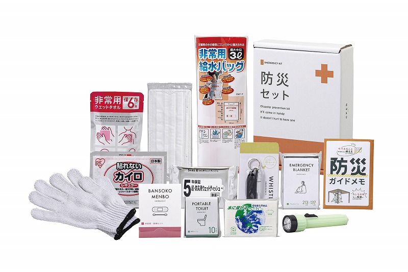 蓄光LEDライト、静音アルミブランケット、携帯トイレ(1回分)、非常用呼子笛(IDカード付き)、非常用ウェットタオル、水に流せるポケットティッシュ、使い捨てマスク、使い捨てカイロ、軍手、非常用給水バッグ(3L)、絆創膏・綿棒セット、ウェットティッシュ(5年保存)、防災ガイドメモ