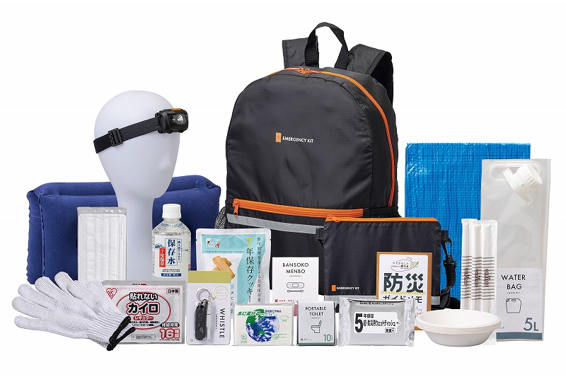 エマージェンシーリュック BK、ブルーシート、水に流せるポケットティッシュ、ウェットティッシュ(5年保存)、給水バッグ5L、携帯トイレ(1回分)、使い捨てカイロ、使い捨てマスク、絆創膏・綿棒セット、エマージェンシーサコッシュ ブラック、軍手、乾電池式ヘッドライト、エアークッション、非常用呼子笛(IDカード付き)、完封割箸、紙皿(おわん型) 10枚入、アルカリ保存水、7年保存クッキー、防災ガイドメモ