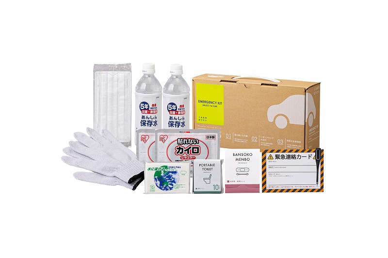 軍手、携帯トイレ(1回分)、絆創膏・綿棒セット、保存水、使い捨てカイロ、水に流せるポケットティッシュ、緊急連絡カード、クリップペンシル(キャップ付き)、使い捨てマスク