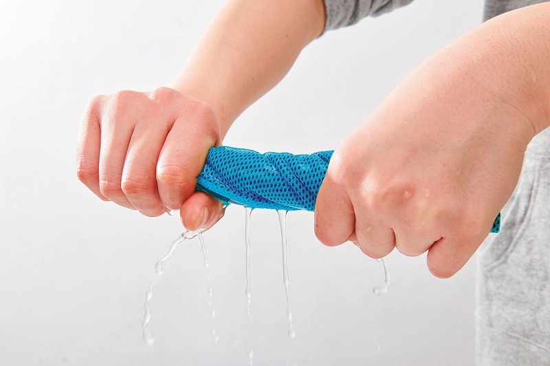 水で濡らしたタオルから水分が蒸発するときに周囲の熱を奪い、ひんやりとした涼感を感じられます。