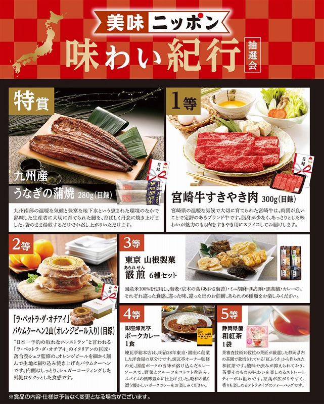 <キット内容> [特賞]九州産 うなぎの蒲焼280g(目録)・・・1本 [1等]宮崎牛 すきやき肉300g(目録)・・・1本 [2等]「ラ・ベットラ・ダ・オチアイ」バウムクーヘン2山(オレンジピール入り)(目録)・・・2本 [3等]東京 山根製菓 霰煎6種セット・・・3本 [4等]銀座煉瓦亭ポークカレー1食 ・・・5本 [5等]静岡県産和紅茶1袋 ・・・88本 <付属> 抽選くじ×100、抽選箱×1、くじ明細書×1、告知用A4カード×1 ※賞品の内容・仕様は予告なく変更となる場合がございます。