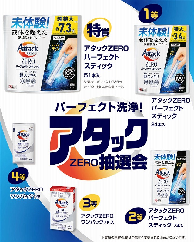 <キット内容> [特賞]アタックZEROパーフェクトスティック 51本入 ・・・1本 [1等]アタックZEROパーフェクトスティック 24本入・・・1本 [2等]アタックZEROパーフェクトスティック 7本入・・・2本 [3等]アタックZEROワンパック7包入・・・4本 [4等]アタックZEROワンパック1包・・・42本 <付属> 抽選くじ×50、くじ明細書×1、抽選箱×1、告知用A4カード×1 ※賞品の内容・仕様は画像と異なる場合があります。あらかじめご了承ください。