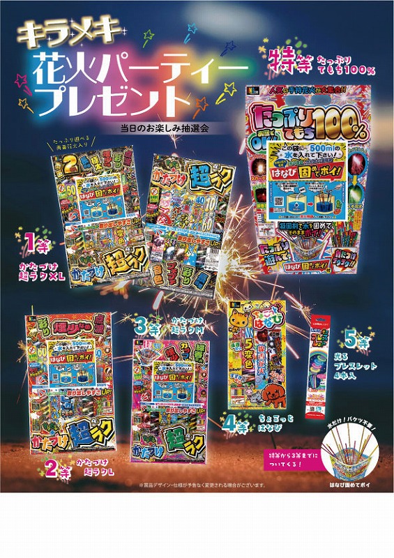 特等:たっぷりてもち100%×1コ・1等:かたづけ超らくらくXL×2コ・2等:かたづけ超らくらくL×3コ・3等:かたづけ超らくらくM×6コ・4等:ちょこっとはなび×8コ・5等:光るブレスレット4本入×80コ/A3ポスター/抽選箱/くじ50枚/くじ明細書/店頭用お知らせPOP2枚