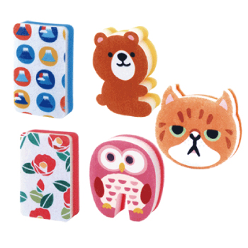 写真印刷も可能なキッチンスポンジ。企業マスコットや地域キャラクターに合わせたダイカットも可能です。まずはお見積り・お問い合わせください。