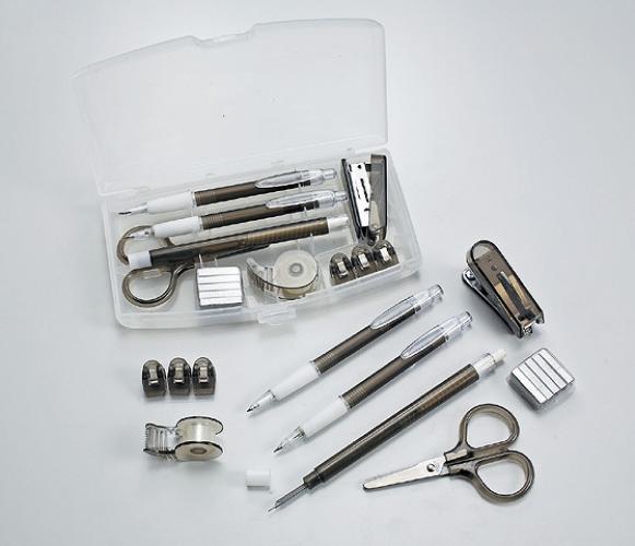 ボールペン×1、シャープペンシル×1、消しゴム&シャープ芯ケース(シャープ替芯入)×1、ステープラー×1、ハサミ×1、セロテープカッター×1、クリップ×3、ステープラー替針