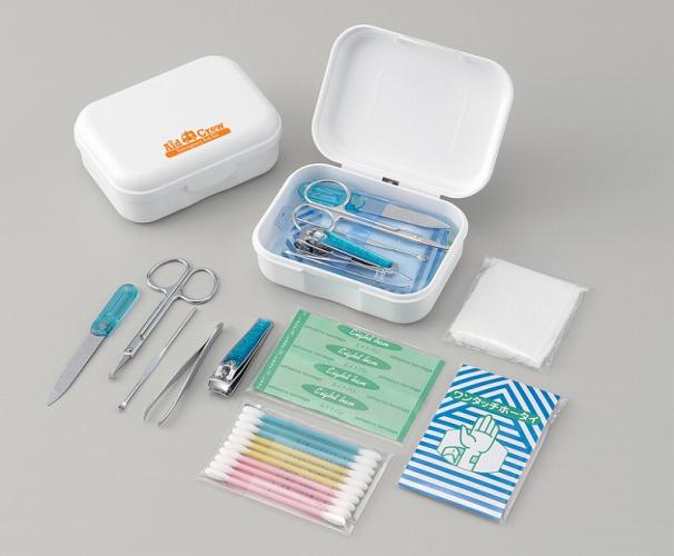 専用ケース、キズテープM(3枚入)、ワンタッチ包帯、コットンパフ(3枚入)(日本)、グルーミング5点セット(爪切り、エチケットハサミ、耳かき、爪ヤスリ、毛抜き兼ピンセット)(中国)、カラー綿棒(10本入)(タイ)