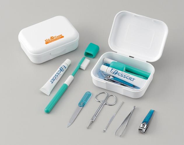 専用ケース、歯ブラシ(歯ブラシカバー付)、ハミガキ(日本)、グルーミング5点セット(爪切り、エチケットハサミ、耳かき、爪ヤスリ、毛抜き兼ピンセット)(中国)
