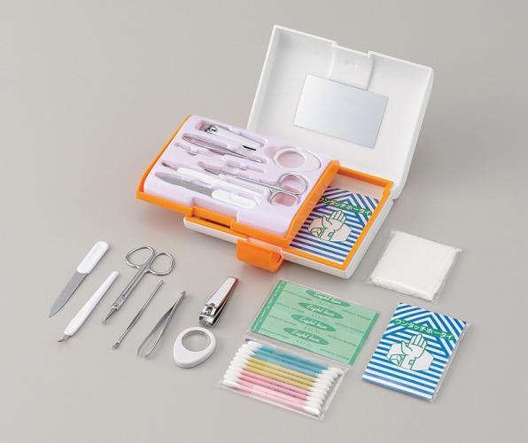 専用ケース(鏡付)、キズテープM(3枚入)、ワンタッチ包帯、コットンパフ(3枚入)(日本)、グルーミング7点セット(爪切り、エチケットハサミ、耳かき、爪ヤスリ、毛抜き兼ピンセット、キューティクルカッター、ルーペ)(中国)、カラー綿棒(10本入)(タイ)