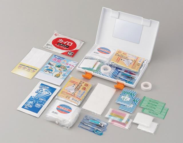 専用ケース(鏡付)、キズテープM(3枚入)×2、ワンタッチ包帯×2、コットンパフ(3枚入)×2、冷却シート(2枚入)、カイロ、携帯トイレ(吸水ポリマー付)(日本)、グルーミング5点セット(爪切り、エチケットハサミ、耳かき、爪ヤスリ、毛抜き兼ピンセット)、マスク、ガーゼ中(10枚入)、サージカルテープ、ポケットレインコート、保温断熱シート(中国)、カラー綿棒(10本入)×2(タイ)