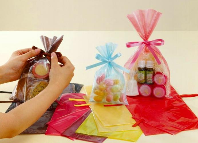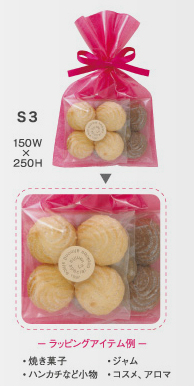 リボンのセットが簡単に行えるように、クリアバッグを二つ折りのリボンがあらかじめとおっているタイプです。