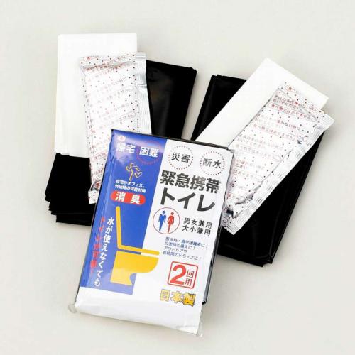 災害の断水時に数時間でも一番困るのが「トイレ」です。防災セットの部材として用意したり、単品として携帯したりと備えておくと安心です。