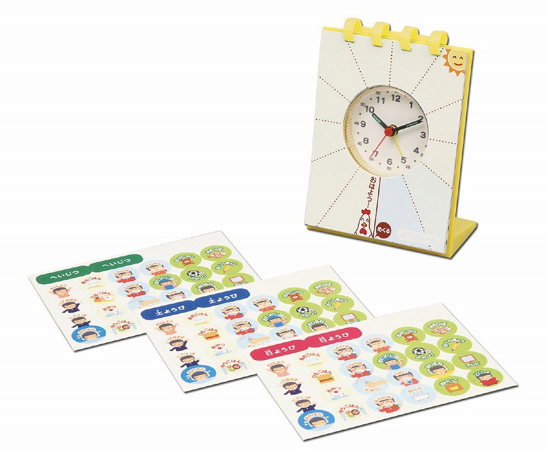 時計の学習と、規則正しい生活を身につける事ができます。時計本体に付いているスケジュール台紙にシールを貼って、一日の予定をたてます。