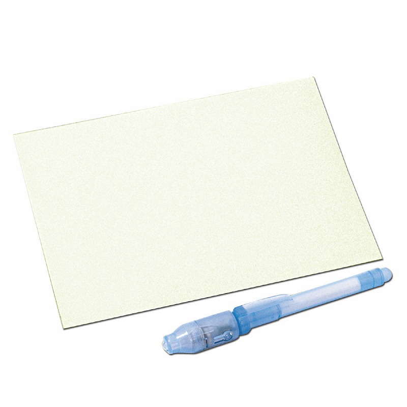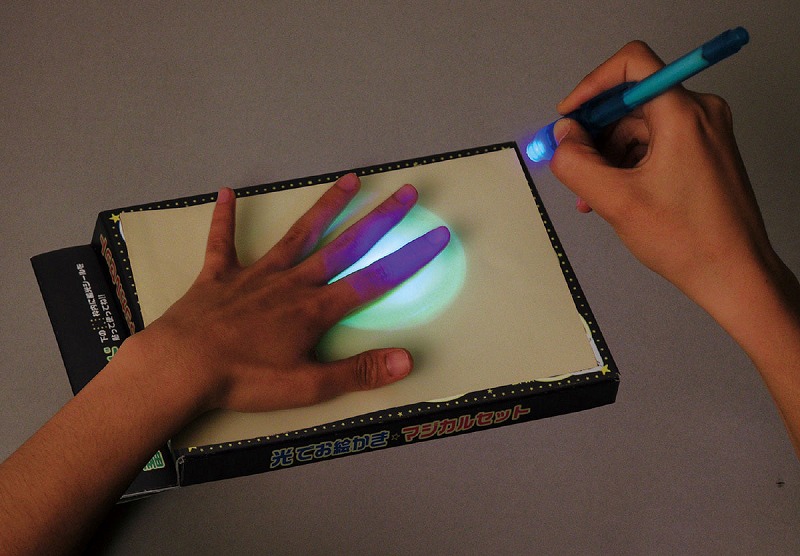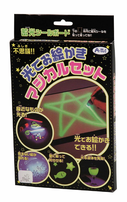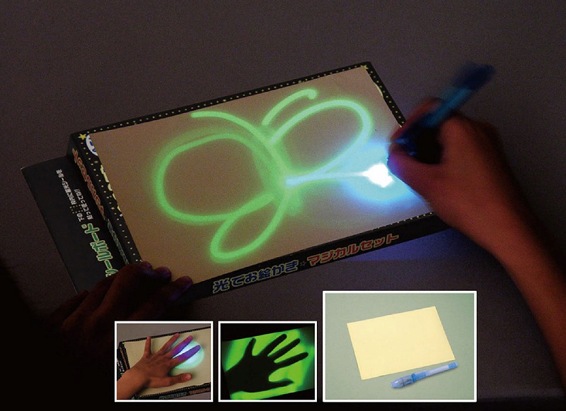 ブラックライトを蓄光シールに照射し、絵を描いたり影をつけたりする科学キットです。