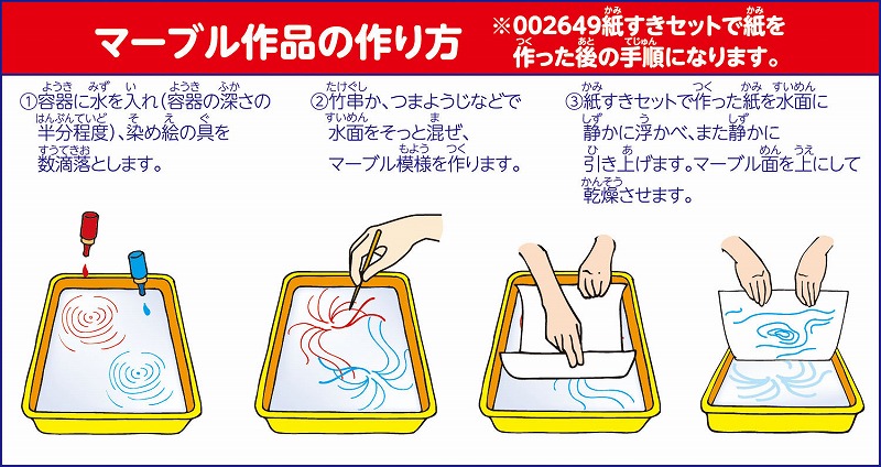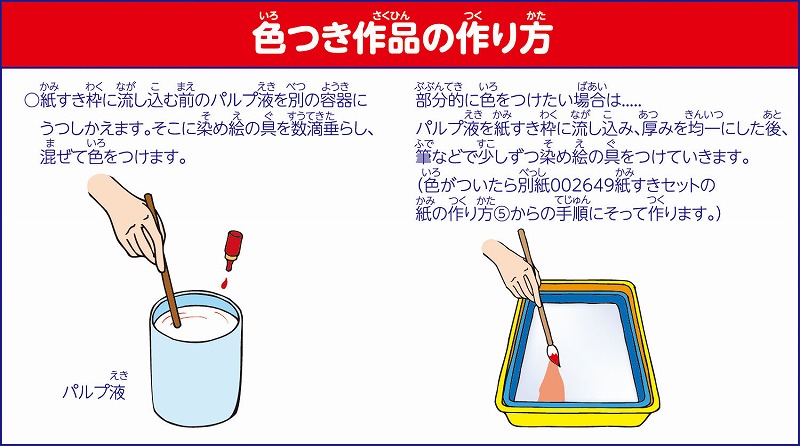 容器×1、紙すき枠×1、網×2、透明板×1、染絵具3色セット×1