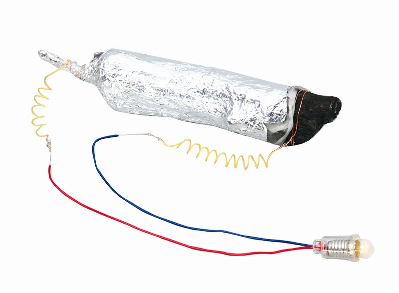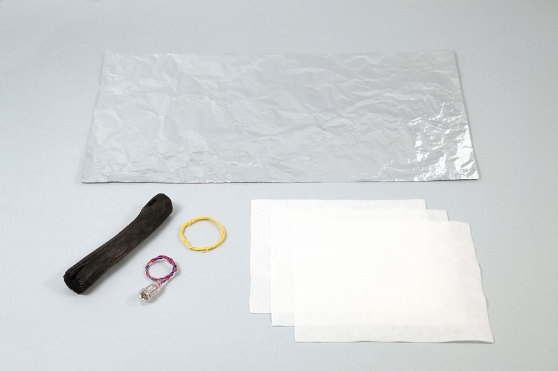 備長炭×1、ビニール導線(1m)×1、キッチンペーパー×3、アルミホイル25×50cm×1、豆電球(2.2V 0.11A)×1、ソケット×1