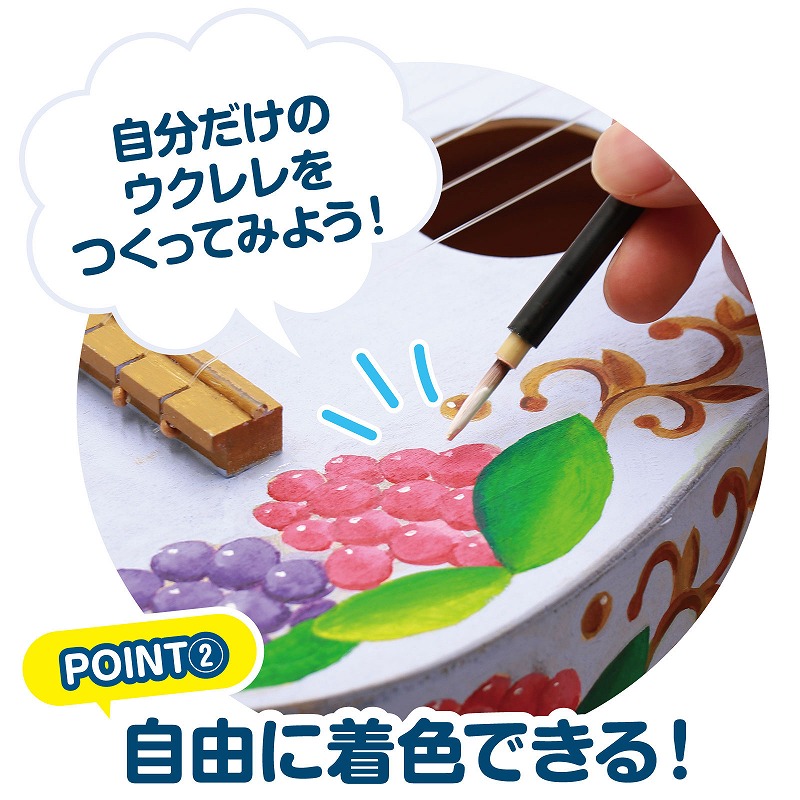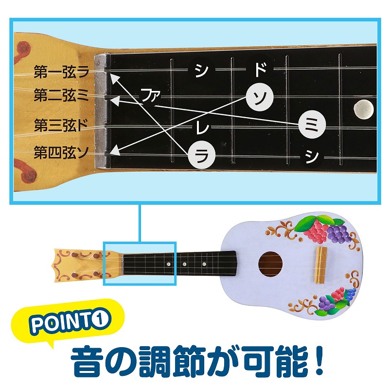 表、裏用合板(250×190mm)打抜加工×2、案内用ベニヤ カット済×4、側面板×1、弦駒×1、弦巻き×4、ネック×1、弦×4、指板×1、あて木×2、うめ木×1、型紙×1、ビーズ×6、ワゴム×4、紙やすり×2
