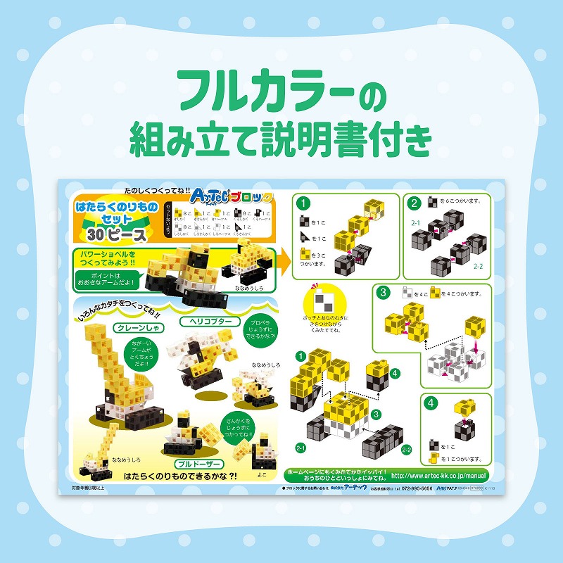 30pcs ・基本パーツ(白×8、黒×8、黄×9) ・三角パーツ(白×1、黒×1、黄×1) ・ハーフAパーツ(白×1、黄×1)遊び方説明書付化粧箱