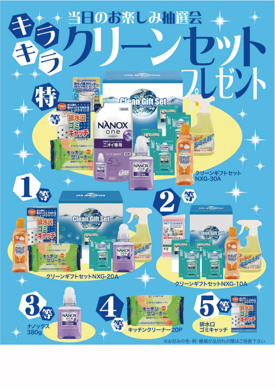 特等 ナノックス&ホームギフト NXG-30・・・1本 1等 ナノックス&ホームギフト NXG-20・・・2本 2等 ナノックス&ホームギフト NXG-10・・・3本 3等 ナノックス400g・・・6本 4等 キッチンクリーナー20P・・・10本 5等 排水口ゴミキャッチ8P・・・78本 【付属品】 ■抽選用くじ(100人用100枚) ■抽選箱 1個 ■くじ明細書 1枚