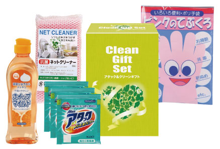 花王アタック(27g×3包)×1・ホイップマイルド(台所洗剤・250ml)×1・抗菌ネットクリーナー×1・ピンクの手袋(5P)×1