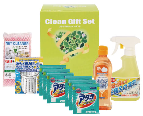 花王アタック(27g×3包)×2・ホイップマイルド(台所洗剤・250ml)×1・お風呂の洗剤スプレー(300ml)×1・洗たく槽クリーナー×1・抗菌ネットクリーナー×1