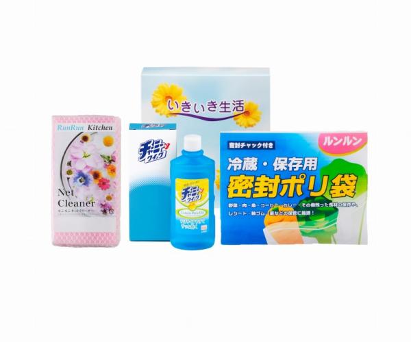 ライオンチャーミーVクイック100ml×1、ルンルンネットクリーナー(ピンク・ブルー・イエローのアソート)×1、密封ポリ袋(フリージングパック)2枚入×1