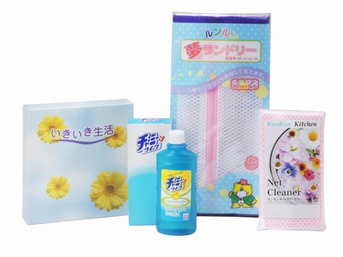 ライオンチャーミーVクイック100ml×1、ルンルンネットクリーナー(ピンク・ブルー・イエローのアソート)×1、洗濯ネット(角型小)×1