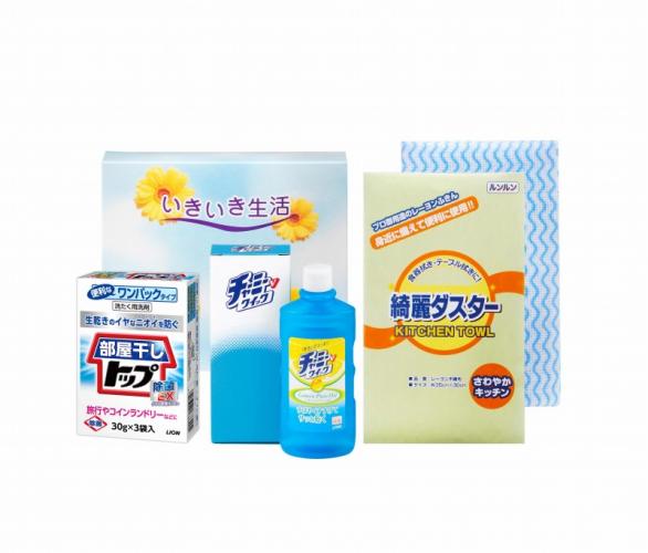 ライオンチャーミーVクイック100ml×1、ライオン部屋干しトップ30g×3包×1、綺麗ダスター(ふきん、ブルー)×1