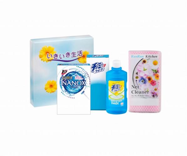 ライオンチャーミーVクイック100ml×1、ライオン液体洗剤ナノックス16g×2包×1、ルンルンネットクリーナー(ピンク・ブルー・イエローのアソート)×1