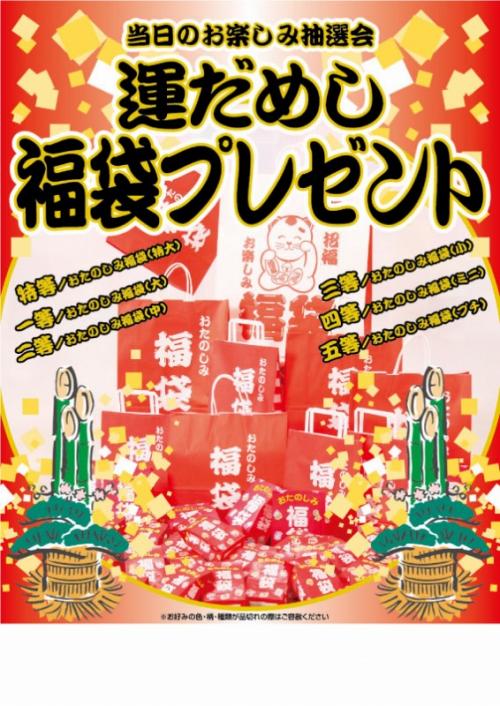 特等 おたのしみ福袋(特大)・・・1本 1等 おたのしみ福袋(大)・・・2本 2等 おたのしみ福袋(中)・・・3本 3等 おたのしみ福袋(小)・・・4本 4等 おたのしみ福袋(ミニ)・・・5本 5等 おたのしみ福袋(プチ)・・・35本 【付属品】 ■抽選用くじ(50人用50枚) ■抽選箱 1個 ■くじ明細書 1枚
