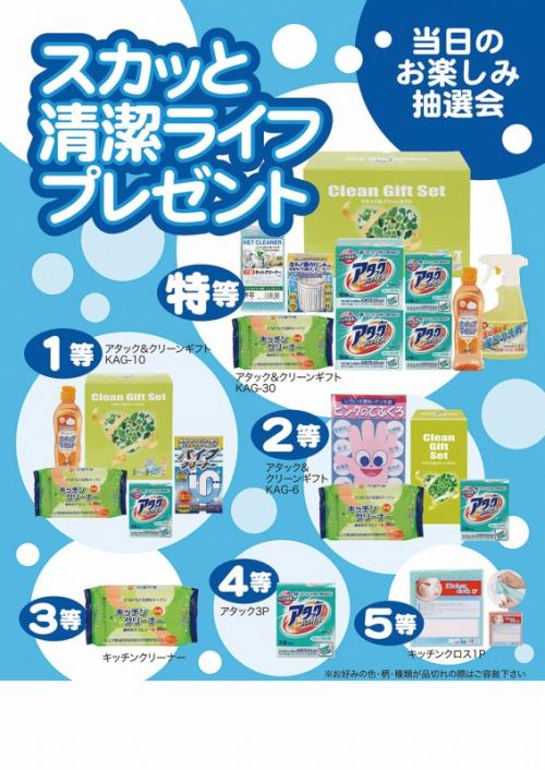 特等 アタック&クリーンギフトKAG-30・・・2本 1等 アタック&クリーンギフトKAG-10・・・3本 2等 アタック&クリーンギフトKAG-6・・・5本 3等 キッチンクリーナー20P・・・8本 4等 アタック3P(27g×3)・・・16本 5等 キッチンクロス1P・・・66本 【付属品】 ■抽選用くじ(100人用100枚) ■抽選箱 1個 ■くじ明細書 1枚