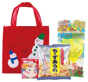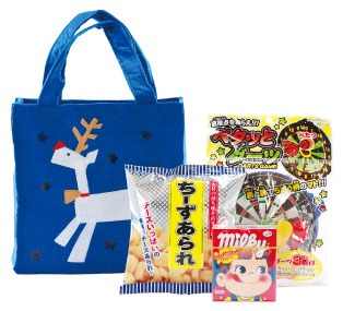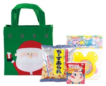 クリスマスバッグにおもちゃがひとつとお菓子がふたつ入ってます