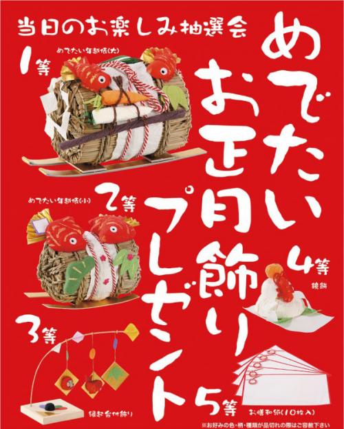 1等 めでたい年越俵(大)・・・1本 2等 めでたい年越俵(小)・・・2本 3等 縁起台付飾り・・・3本 4等 鏡餅・・・4本 5等 お膳和紙(10枚入)・・・20本 【付属品】 ■抽選用くじ(30人用30枚) ■抽選箱 1個 ■くじ明細書 1枚