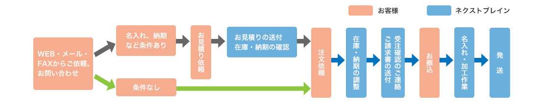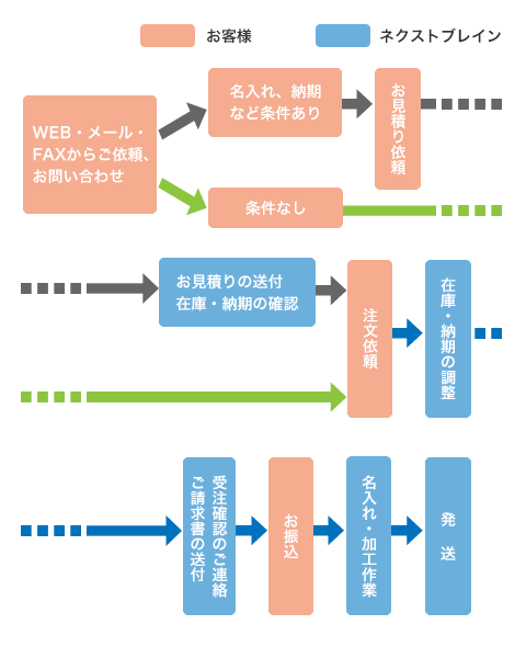 『内容確認』 ⇒ 『お客様情報入力』 ⇒ 『添付ファイル・コメント入力』 ⇒ 『完了』※名入れ・包装・のし等が必要な場合は見積依頼よりご依頼ください。