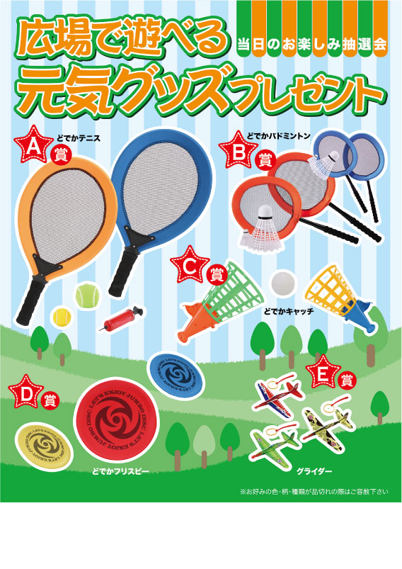 A賞:どでかテニス×2コ・B賞:どでかバドミントン×2コ・C賞:どでかキャッチ×4コ・D賞:どでかフリスビー×4コ・E賞:グライダー×88コ/A3ポスター/抽選箱/くじ100枚/くじ明細書/店頭用お知らせPOP2枚