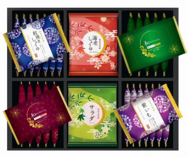 粒焼きしょうゆ×8枚、紫いも×8枚、ざらめ×6枚、青のりしょうゆ×6枚、丸サラダ×4枚、海老しょうゆ×4枚