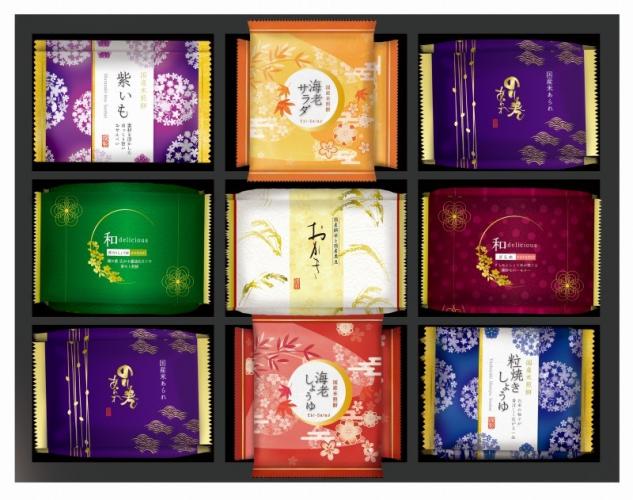 のり巻あられ×16枚、紫いも×8枚、粒焼きしょうゆ×8枚、ざらめ×6枚、青のりしょうゆ×6枚、黒豆入りおかき×6枚、海老サラダ×4枚、海老しょうゆ×4枚
