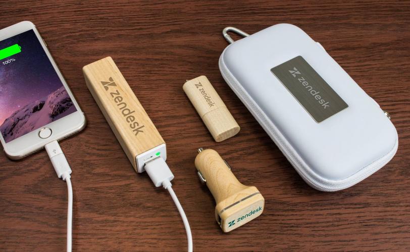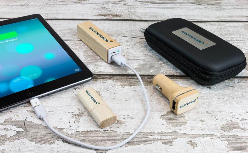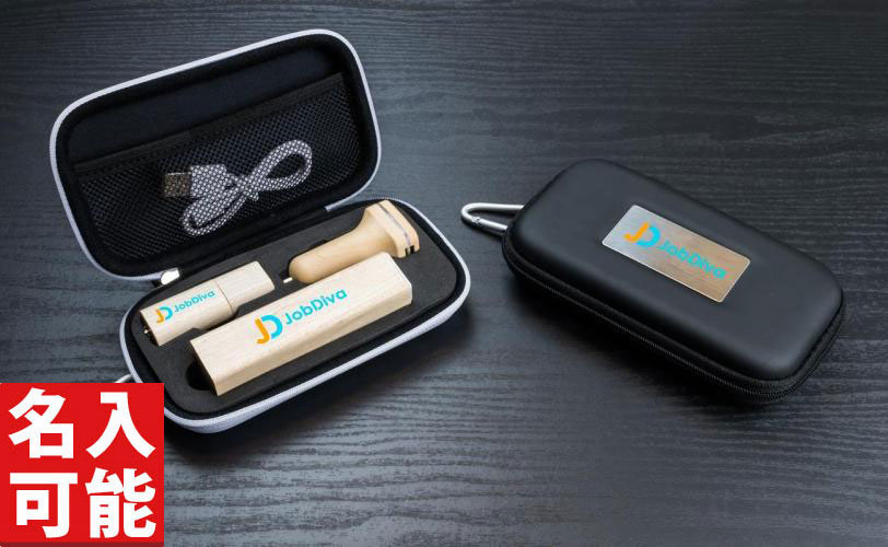 Nature USBメモリとMapleモバイルバッテリーとWoodie USBカーチャージャーの3商品を組み合わせたトラベルギフトセット。それぞれの商品とケースに名入れできます。