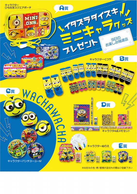 A賞:キャラクターひも付スクエアポーチ×6/B賞:キャラクターくつ下×6/C賞:キャラクターパンチヨーヨーM×10/D賞:キャラクター4点目メモセット×10/E賞:キャラクターぬりえ×68/A3ポスター/抽選箱/くじ100枚/店頭用お知らせPOP2枚