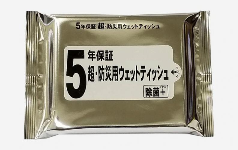 業界最長、「5年保証」の防災用のウェットティッシュです。除菌効果の高いウェットティッシュを採用しております。(弊社メンソール入り除菌ウェットと同等)。受注後生産につき、納品から5年間の安定した品質保証をいたします。防湿性の高いアルミ蒸着のフィルム、本体にも5年保証を謳い、ビジュアル的な判りやすさを追求しました。防災用グッズ、家庭用常備品として最適です。