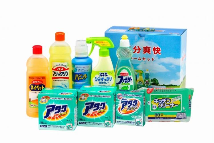 花王アタック27g×10包×2、花王アタック24g×3包×1、ワイドハイターしみすっきり泡スプレー300ml×1、花王ファミリーフレッシュ350ml×1、花王マイペット500ml×1、花王ハミング400ml×1、花王バスマジックリン500ml×1、キッチンクリーナー30枚×1