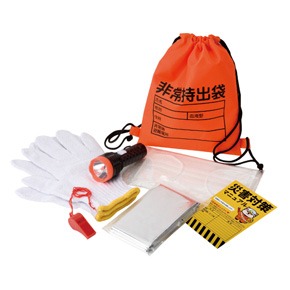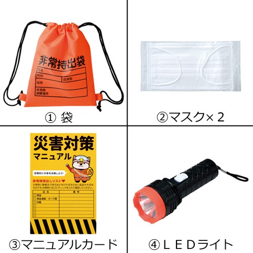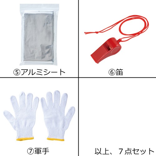 袋×1・マニュアルカード×1・LEDライト×1・アルミシート×1・マスク×1・軍手×1・笛×1