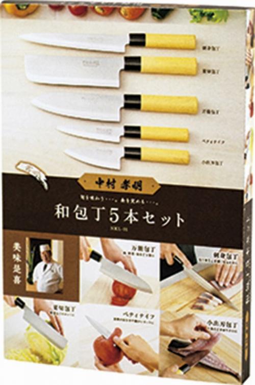刺身包丁/330×30×19mm(刃渡り:205mm)、菜切包丁/310×50×23mm(刃渡り:170mm)、万能包丁/300×45×22mm(刃渡り:170mm)、ペティナイフ/235×28×17mm(刃渡り:120mm)、小出刃包丁/223×39×17mm(刃渡り:107mm)