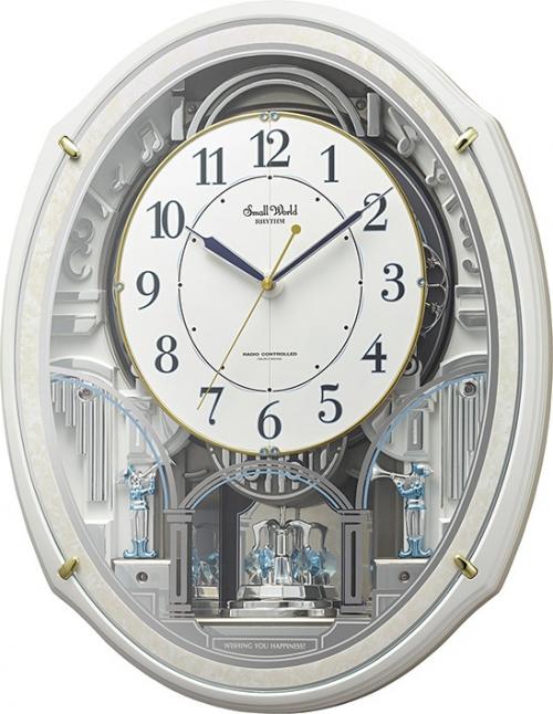 記念品等の名入れ承ります。名入れ代、包装代等お見積り致します。白を基調とした明るいカラーリングのからくり時計。ガラスには、お城をイメージしたアーチのデザインが施され、奥行と華やかさを演出しています。ファミリーで楽しむことができるメロディと、ダイナミックアクションにこだわりました。オーロラサウンドメロディ全48曲収録。