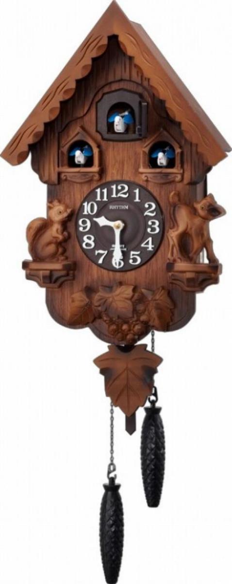 鳴り止めスイッチ付/中央の巣穴のみ扉があり、通常は扉を閉じカッコーは見えていません。左右のカッコーは常時見えています。/飾り重錘・飾り振子付/2針式
