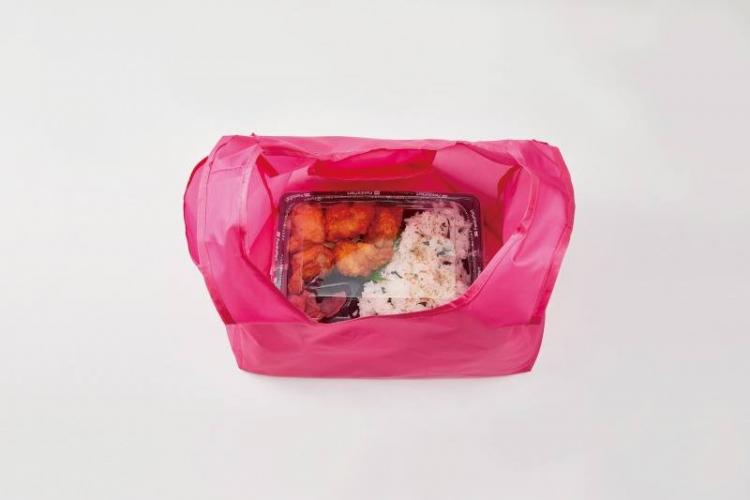 市販のお弁当をフラットに持ち運べる底の広いエコバッグ。買ったお弁当が斜めに偏るストレスから解放され、レジ袋削減にも役立つ環境に優しいエコグッズです。ちょっとしたお買い物にも便利なサイズです。